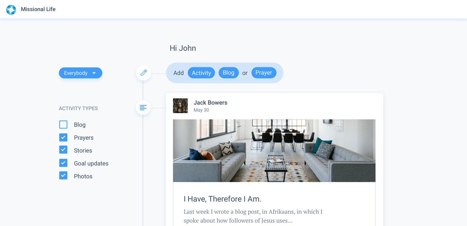 Community is imperative to the success of living a missional life. Sharing a story about your ongoing missional activity allows others to track your journey while encouraging them in theirs. Missional.Life allows you to share stories, pictures, and updates to your community about the mission you are on today. You can think of this as your missional resume.