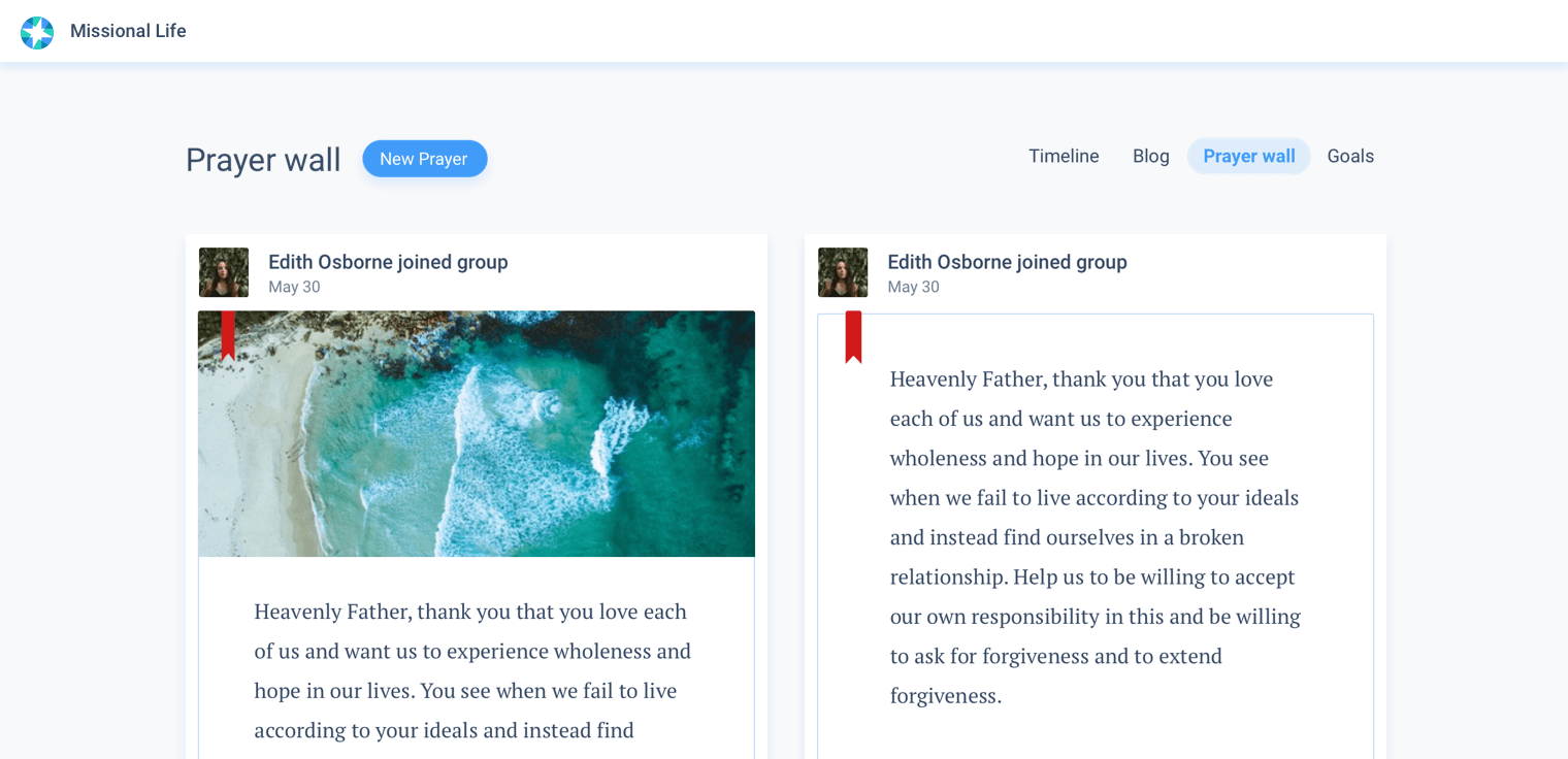 Within your Missional Community you can post the things you are praying for and let others know that you are praying for them as well. The Prayer Wall allows you to post and update prayers in real time so that your community can partner with you in your calling.