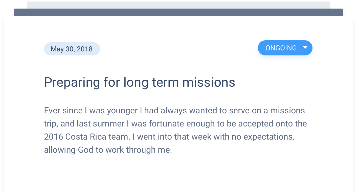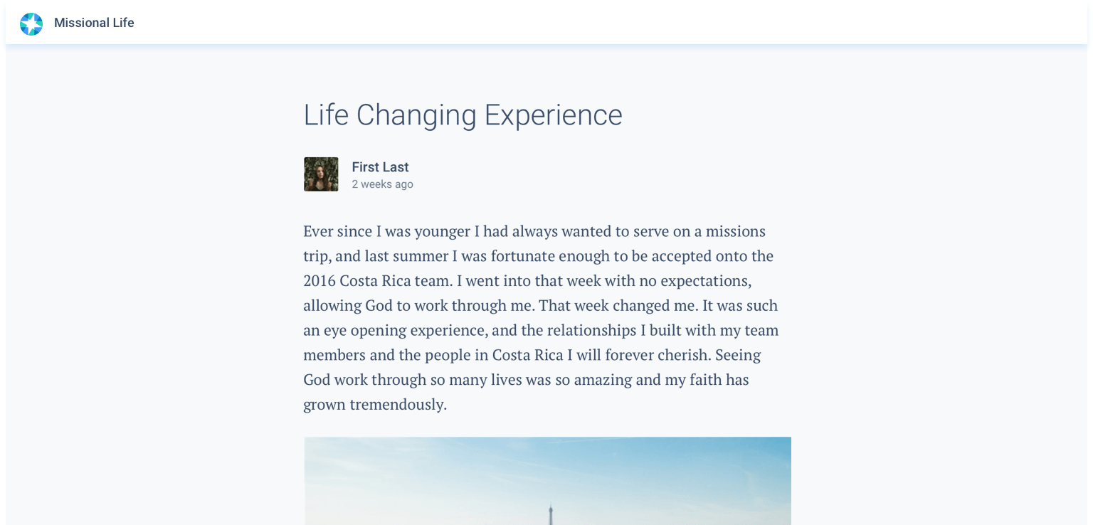 As you travel or once you're home, Missional.Life allows you to update your community with a post about every trip you take, whether out of the country or down the street. Each post allows you to pin your trip's location, upload photos, and share an update with your community of all that God did!